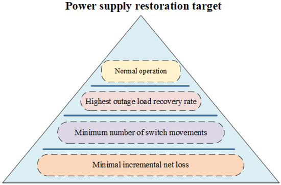 The objectives are stratified based on multi-objective power supply restoration, and strict priorities are determined among the objectives. There are four objectives for power supply restoration, namely “normal operation of the distribution network”, “highest outrage load recovery rate”, “minimum number of switch movements”, and “Minimal incremental net loss”. These objectives are prioritized in descending order to enhance the reliability of the distribution grid, as shown in Figure 3.