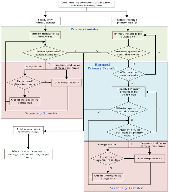 Based on the power supply restoration objective and topology evolution model of the distribution network, the topology evolution process in the power supply restoration process of the distribution network is introduced, and the load transfer model is used to determine whether the current distribution network meets the requirements, and the process is shown in Figure 4.