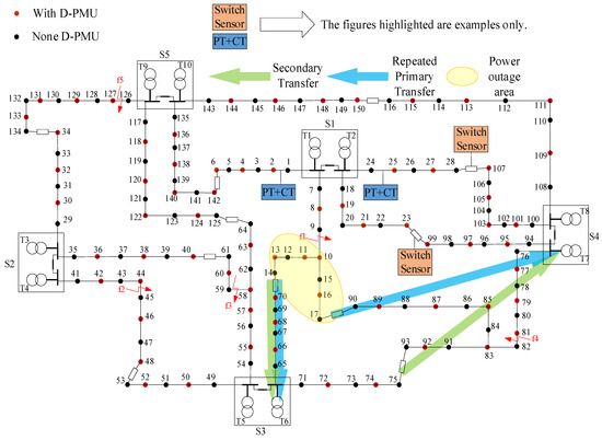 In order to verify the correctness and effectiveness of the proposed fault recovery strategy, a distribution network model with traditional sensors and intelligent sensors D-PMU was established on the TigerGraph database according to a regional distribution network in Shaanxi Province, and five faults are set, as shown in Figure 5. According to the above fault recovery process, different power supply recovery strategies are identified, and their advantages and disadvantages are evaluated.