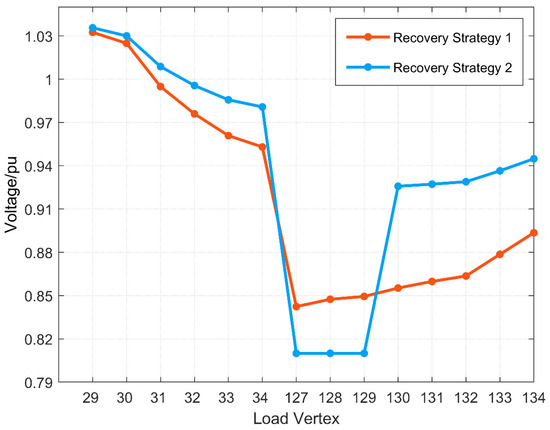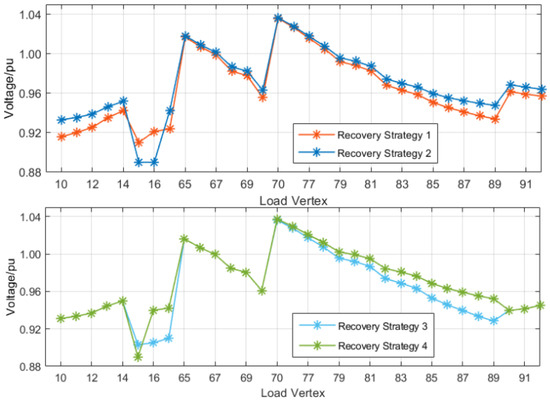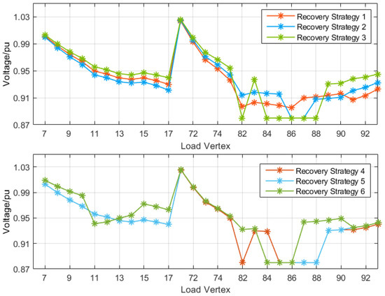 Figure 10 shows the main variable load ratios in each restoration strategy for faults f2, f3, and f5, and Figure 11 and Figure 12 show the voltage distribution of each load vertex in each restoration strategy for faults f2 and f5 with the reconfiguration set R, respectively. Since there is only one restoration strategy for fault f3 and the reconfigured distribution grid satisfies the voltage constraint, the voltage distribution of fault f3 is not listed separately.
