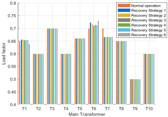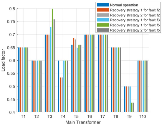 Transformer load factor in each restoration strategy of faults f2, f3, and f5.