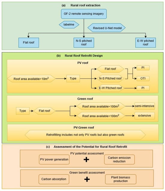 The development of high-resolution remote sensing imagery and deep learning technology provides preliminary data support for roof retrofitting, and the research for roof retrofitting methods is also gaining more and more attention from scholars. In existing studies, roof retrofitting is mostly in a single form such as PV roofs or green roofs. Yuliani et al. conducted a study on the development of rural green roofs based on a questionnaire, and the results indicate the need to optimize the role of the community as a means of increasing public awareness of green roofs and thus promoting their development []. Liu et al. developed a prioritization index that considered the green space needs of urban functional areas and the suitability of green roofs as a means of quantifying the urban functional areas that are most in need of and suitable for green roof implementation []. Hamid et al. used a literature review and questionnaire surveys to find that the main barriers to green roof implementation in Malaysian cities are construction costs, maintenance costs, etc., and based on the reasons for these priorities to effectively develop green roof implementation strategies []. Baek et al. determined the appropriate green roof area based on building type and classified green roof types into low, medium, and high management based on green roofs []. Hong et al. assessed the potential of green roofs based on the existing and planned buildings, established the indicators of green roof implementability based on the rooftop attributes, and established a strategy for the implementation of the prioritization strategy for green roofs []. Aleksejeva et al. classified the available space for green roofs through a GIS approach and assessed the potential of green roofs for subjective well-being, air pollution mitigation, and biodiversity []. For the study of PV roofs, a number of scholars have focused on the assessment of roof PV potential around building density, land use data, roof type, etc. Izquierdo et al. estimated the usable area of roofs and PV potential in Spain based on representative cities and a number of readily available data such as land use, population, and building density []. Ghaleb et al. calculated PV potentials for utilization efficiency and PV power generation potential for different commercial building types []. Tian et al. calculated the total roof area of cities based on open-source satellite data and evaluated their PV power generation potential []. Liu et al. evaluated the PV potential of rural roofs using a method that utilizes three-dimensional building models, and their results are important for the development of rural renewable energy, providing a database for solar PV policy development and an important initiative for decision makers to combat climate change []. Sun et al. proposed an improved method of installing rooftop photovoltaic panels based on idle rural roofs, obtaining the distribution of PV potential at the village and town scales in rural northern China, and their approach to rural rooftop PV potential can promote the rural energy transition and accelerate the development of clean energy, and their results provided information on the distribution of PV potential for policy makers [].