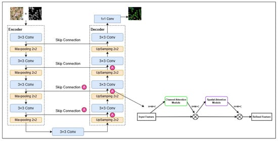 In order to improve the extraction accuracy of the U-Net model, the model was improved in this study. Firstly, the model introduces the CBAM attention mechanism []. The main goal of CBAM is to improve the model’s perceptual capabilities by introducing channel attention and spatial attention, thus without increasing the complexity of the network improving performance. The CBAM attention mechanism first performs the average pooling and maximum pooling operations on the input feature maps in the channel dimensions to obtain two different spatial feature maps, and the spatial feature maps are spliced and then passed through a convolutional layer for feature fusion and dimensionality reduction to obtain the spatial attention weight map. In order to prevent excessive learning caused by too many attentional mechanisms, this model only adds attentional mechanisms at the first two jump connections and the first three upsampling processes. Meanwhile, in order to enhance the building features and building edge extraction accuracy, the extraction results of the U-Net model based on the attention mechanism in this study are combined with the original image to form a four channel, which is again extracted by the model with the addition of the attention mechanism. The original feature extraction network can only accept RGB three-channel images, so this study extends the first layer structure to accept the multi-band structure and uses GDAL 3.2.3. to read the images.