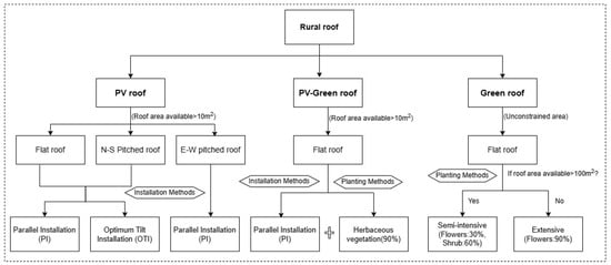 In this study, three types of retrofitting methods, namely PV roofs, green roofs, and PV-green roofs, were designed based on Pan et al. [] taking into account the type, orientation, and area of rural roofs. Figure 4 illustrates the three types of retrofits.