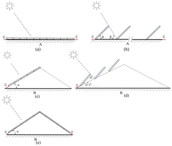 Installation of PV panels on different roof types. (a) PI method on flat roofs; (b) OTI method on flat roofs; (c) PI method on N-S pitched roofs; (d) OTI method on N-S pitched roofs; (e) PI method on E-W pitched roofs.