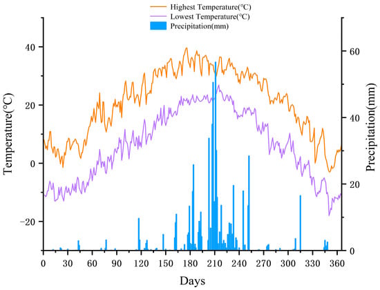 Green roofs not only absorb carbon dioxide but also produce plant biomass. In this study, the DNDC model was used to simulate the CO2 uptake rate and plant biomass production of green roofs in the study area. The simulation of the DNDC model requires the input of three parameters: daily meteorological data (precipitation and maximum and minimum temperatures), soil number parameters, and plant physiological data. The daily meteorological data were averaged from 2021 to 2023, as shown in Figure 6, and the sources of soil parameters and plant physiological data mainly referred to Jing’s setup parameters [], as shown in Table 2. Its specific soil parameters include the land-use mode, soil texture, irrigation, and so on. The plant’s physiological parameters mainly include the annual N demand, water demand, and optimum temperature. Finally, the CO2 uptake rate and plant biomass production were calculated by inputting the above parameters into the DNDC model.