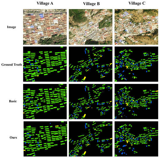 In this study, three villages, A, B, and C, are taken as examples, and Figure 7 compares the differences between the extraction results using the original model and the improved model with the real labels and the original images, respectively. It can be found that the extracted results have a high degree of similarity with the original images, which can be used in the subsequent analysis of the multifunctional roof retrofitting.