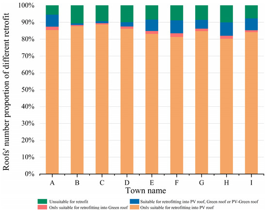 Figure 8 shows the proportion of different roof retrofit types in the study area on a town basis, with the largest proportion applicable to PV roof retrofits only, at an average of 83.2%; the average proportions of those unsuitable for retrofitting and those applicable to all three types of roof retrofits were 8.5% and 5.1%, respectively; and the smallest proportion applicable to retrofitting green roofs only was an average of 1.4%. In order to visualize the distribution of the different retrofitting methods more closely, Figure 9 shows the specific details of the potential for roof retrofitting.