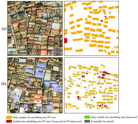 Distribution of different roof retrofitting methods. (a,b) represent two different retrofitting areas.