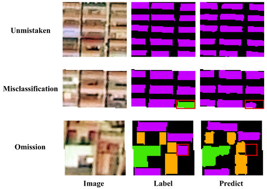 This study extracts different types of rural building roofs based on a deep learning model, and although the accuracy has been improved to a certain extent, the phenomenon of misclassification and omission still occurs, as shown in Figure 10 below. Although there are misclassification and omission errors in roof extraction, the accuracy of the final extraction result is better compared to the previous extraction accuracy of rural buildings. Corbane et al. used Sentinel-2 satellite images with a resolution of 10 m to predict rural residential areas, and the recall was 80.89% []. Liu et al. used Sentinel-2 satellite images with a resolution of 2.5 m to extract rural buildings, and the recall was 78.94% []. While the recall of roofs of rural buildings extracted by GF-2 in this paper was 88.53%, which is greater than both of them, the accuracy is within the permissible range, and it can be used to carry out the subsequent analysis of roof retrofit.