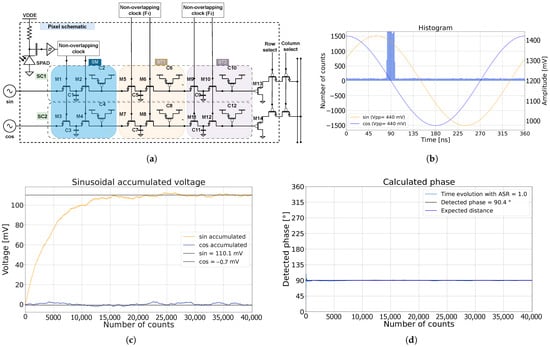 (a) The CA-dToF pixel with multiple stages (ST1) and (ST2), externally driven over the full array with frequencies and , respectively [22]; (b) histogram of the detected photons without dead-time effect, with the applied sinusoidal signals and ASR = 1; (c) the accumulated voltage for the sinusoidal signals; (d) the calculated phase as a function of the detected counted triggers. The expected distance overlaps with the detected phase.