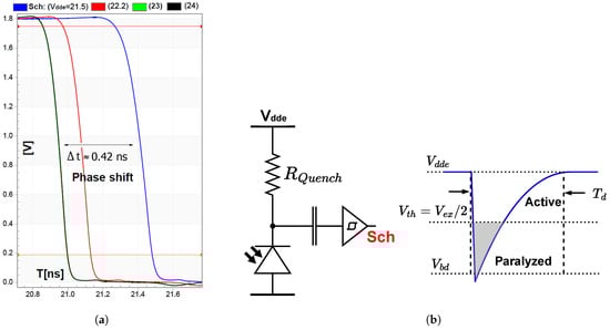 (a) The response of the inverter with different in a simulation when = 500 kΩ and with an overall SPAD and AC coupling capacitance of around 14 fF, showing a propagation delay up to 0.42 ns and varying fall-times; (b) the paralyzing effect of the inverter after a SPAD trigger. In our implementation, = 19.6 V.