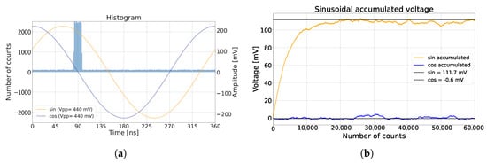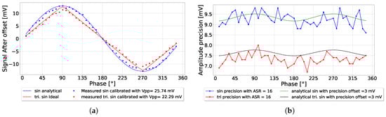 The amplitude precision of the triangular signals was approximated from the analytical model developed in [22], with the modification factor shown in Equations (A3) and (A4) in Appendix A. The amplitude precision was experimentally measured as presented in Figure 11b, with an overall amplitude precision shift of 3 mV. The overall amplitude precision shift was likely associated with the electronic noise floor level of the system. However, further investigation is needed to confirm this. A maximum deviation of 0.5 mV in amplitude precision was observed, which was also the used ADC resolution limit.