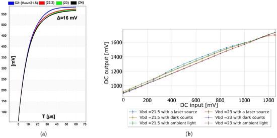 (a) The simulated output transients of the sampling stage for different excess bias voltages, when sampling a DC voltage of 500 mV instead of sampling a sinusoidal signal; (b) the experimental measurements when sweeping this DC voltage for two different excess biased voltages and for different illumination conditions. The simulation and experimental results show the non-linear repose of the switched capacitor for different SPAD , suggesting that switch parasitic noise influenced the switched capacitor performance. However, by applying a higher than 23 V, the switched capacitor response was linear, with minimized switch parasitic noise.