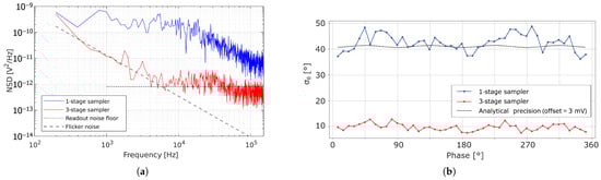 (a) The output voltage NSD for a single-stage and three-stage sampler; (b) the phase precision when ASR = 16.