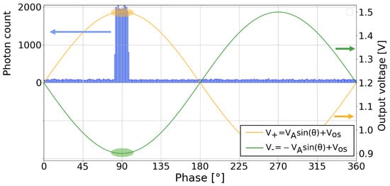 Figure 1b demonstrates how sinusoidal inputs I and Q were sampled by photons in an ideal simulation, under the assumption of zero SPAD deadtime, uniformly distributed ambient light in time, and a laser arrival at phase shift. The applied sinusoidal signals had an amplitude of 220 mV and an offset of 1.2 V. After cancellation of the offsets, the evolutions of the measured voltages are shown in Figure 1c. The measured voltages and stabilized and reached equilibrium, aside from random oscillations due to laser and ambient photon shot noise. The random oscillation determined the amplitude precision and decreased as increased. In this simulation, was 300, with an ambient-to-signal ratio (ASR) of 1. Note that the amplitude of the measured voltages were then attenuated by a factor of 2 due to ambient suppression. The calculated phase of the laser arrival was calculated and is plotted in Figure 1d.