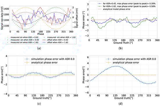 (a) The raw measured sinusoidal voltage and the calculated offset, which oscillates with an amplitude of 2 mV, for two different ASRs; (b) the phase error associated with the measured offset oscillation [22]; (c) the resulting phase error due to a sinusoidal amplitude mismatch of 5 mV when the measured sinusoidal amplitude was 275 mV, or a 2% amplitude mismatch; (d) the resulting phase error due to a sinusoidal offset mismatch of 10 mV.