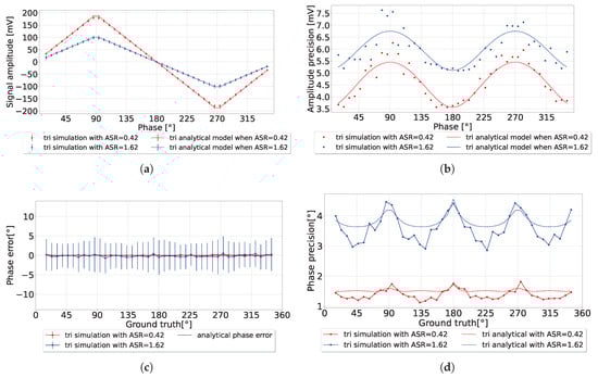 (a) Comparison between the simulation results of triangular amplitude for different ASRs; (b) the amplitude precision; (c) the phase error; (d) the phase precision.