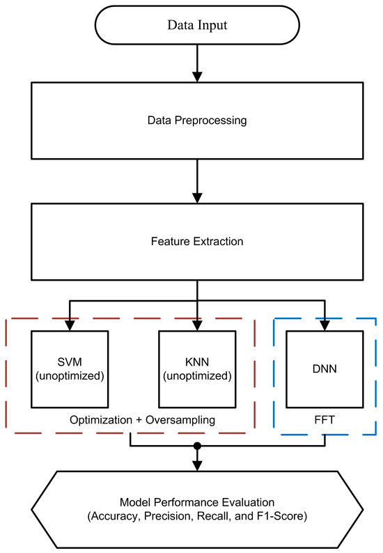 The flowchart of the proposed work: red-dashed box implies the implementation of optimization and oversampling using SVM and KNN; blue-dashed box implies the FFT-based feature extraction applied on DNN.
