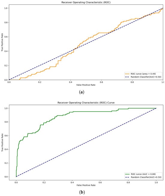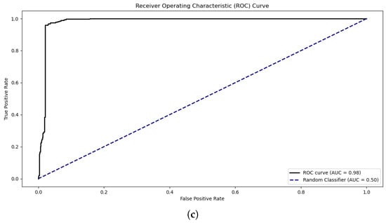 Our evaluation framework employs standard metrics to assess model performance. These metrics provide detailed insights into how well the models handle true positives (TPs), true negatives (TNs), false positives (FPs), and false negatives (FNs). The ROC curves, shown in Figure 3 and Figure 4, illustrate the trade-off between sensitivity and specificity across classification thresholds. The key metrics include the following: Accuracy, which involves measuring overall classification performance as expressed in Equation (3),