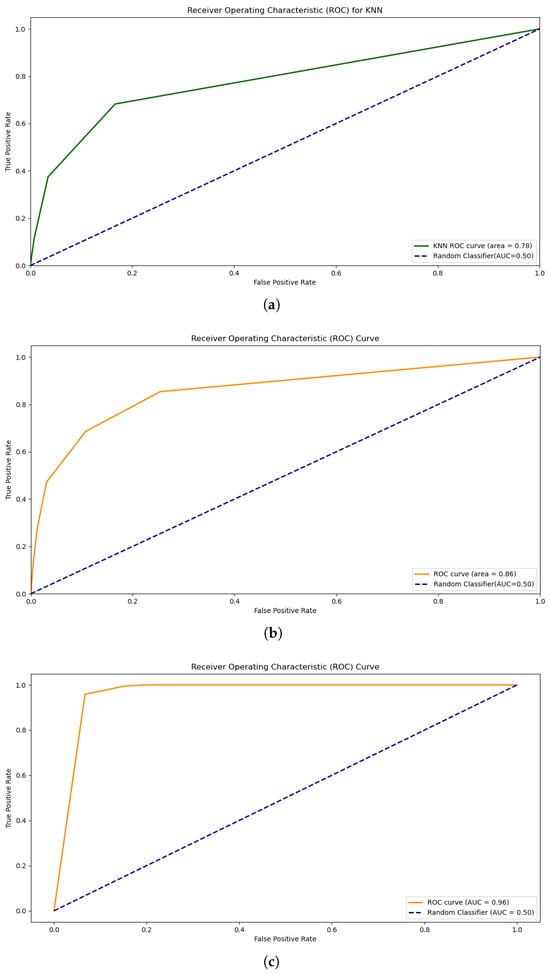 Receiver operating characteristic (ROC) curves of KNN. (a) Unoptimized KNN ROC, (b) Optimized KNN ROC, (c) Oversampled Optimized KNN ROC.