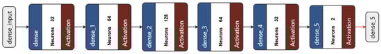 The input layer of the DNN has twenty-one nodes, matching the number of dimensions in the input data pertaining to faults. The hidden layers have five subsequent layers consisting of 32, 64, 128, 64, and 32 neurons, respectively. Each layer uses the rectified linear unit (ReLU) activation function as depicted in Figure 5. The output layer consists of two neurons corresponding to the normal and fault classes. In the output layer, we used the softmax activation function, which offers probability distributions for precise fault classification. Adam is an optimization technique that may be used to update dense neural network weights iteratively based on training data, replacing the traditional stochastic gradient descent approach [33]. We used cross-entropy as the loss function to evaluate the accuracy measure. We stopped training if the loss metric did not improve after two consecutive epochs, preventing an overfitting curve. Thus, the proposed DNN is specifically designed to improve fault classification skills and leverages the model principles to automatically identify complex patterns from the input data.