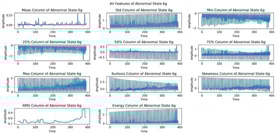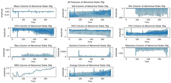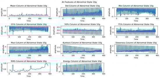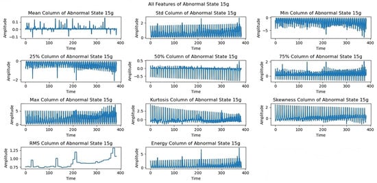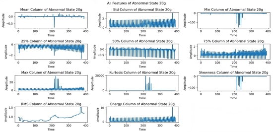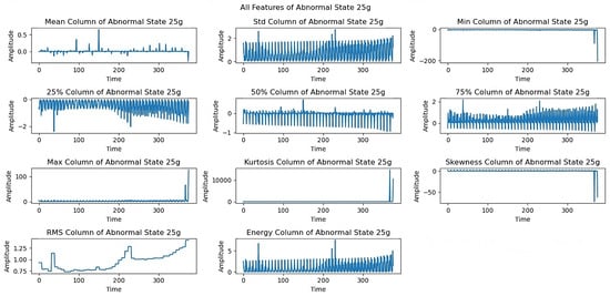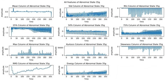 Figure 10 shows the effects of a 20 g load imbalance, resulting in dynamical variations in all features. Skewness and kurtosis are two characteristics that might show significant fluctuations, suggesting that the system is sensitive to increasing imbalance levels. In Figure 11, variations in all extracted features are represented under a 25 g imbalance. Similarly, trends in standard deviation and minimum provide insight into the system’s capability to manage important imbalance issues.