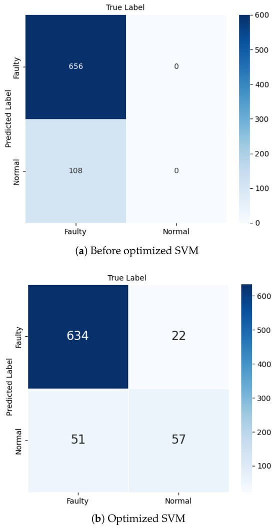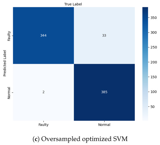 Our experimental validation employed the MAFAULDA dataset [22] to thoroughly evaluate model performance. The classification results are best understood through confusion matrices, presented in Figure 14, which provide a comprehensive view of how well our models distinguish between normal and fault conditions. The detailed performance metrics derived from Figure 14a–c are summarized in Table 6. Among our implementations, the oversampled optimized SVM demonstrated remarkable performance, correctly identifying 344 faulty cases and 385 normal cases, while minimizing misclassifications to just 33 false positives and 2 false negatives. This translated to an impressive 95.4% accuracy, with the model achieving 91.2% precision and 99.4% recall. While the optimized SVM also showed strong performance with 97.2% precision, the unoptimized linear SVM, despite perfect precision (1.00), fell short in overall effectiveness with an accuracy of 85.8%, correctly identifying 656 positive cases but also recording 108 false negatives.