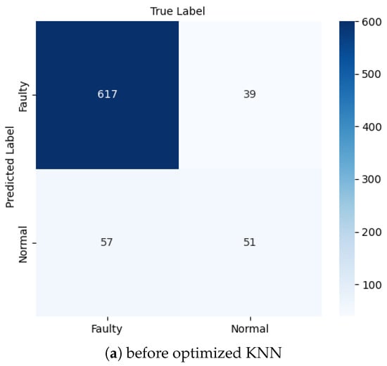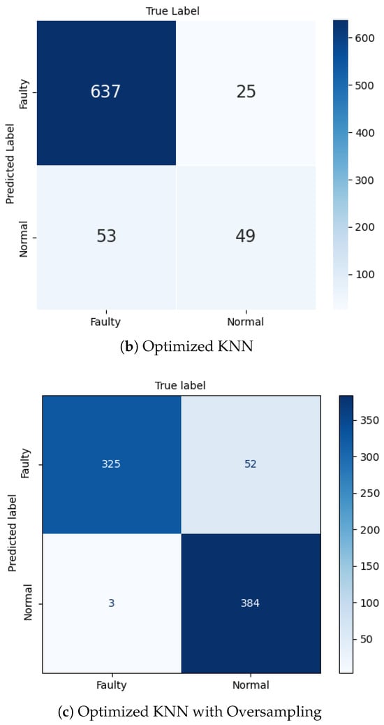 Our KNN implementation underwent similar rigorous testing, with results visualized in Figure 15. The oversampled optimized variant proved most effective, successfully identifying 325 faulty and 384 normal cases, although it produced 52 false positives and 3 false negatives. Table 7 presents the complete performance metrics, calculated using Equations (3)–(6). The oversampled approach achieved 92.8% accuracy with an exceptional 99.1% recall, while the base-optimized KNN showed strong discrimination capabilities with 637 correct positive identifications. The unoptimized version, while achieving a respectable 87.4% accuracy, demonstrated room for improvement through our optimization strategies.