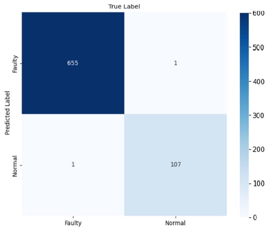 Based on the FFT-based autocorrelation fed data, DNN successfully identified 655 faulty and 107 normal cases, producing 01 false positive and 01 false negative. The significance of the performance becomes clear when considering that the dataset was not balanced through oversampling. This approach achieved a remarkable accuracy of 99.7% with an exceptional 99.9% precision and 99.8% recall. The confusion matrix is depicted in Figure 16.