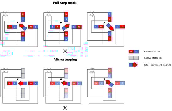 Common actuation sequences for stepper motors. (a) Stepper motor rotating in full-step mode. The coils are always energised, which generates high motor torque; (b) stepper motor rotating in microstepping mode. High position resolution can be achieved by dynamically changing the current in the coils at the cost of torque loss.
