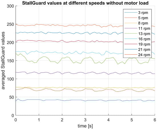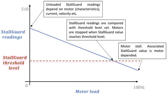 Additional calculations are required to cancel out noise and provide useful feedback on motor load based on back EMF measurements and the stator’s current vector. The TMC2209 stepper drivers are equipped with StallGuard4 technology, which measures the back EMF generated during these zero-current crossings and translates it to an interpretable StallGuard value []. These StallGuard values can be used to detect motor stall and determine motor load, as schematically indicated in Figure 6. The back EMF and thus the StallGuard values highly depend on motor characteristics, the rotor’s permanent magnet, the speed, current, voltage, coil windings, and microstep settings.