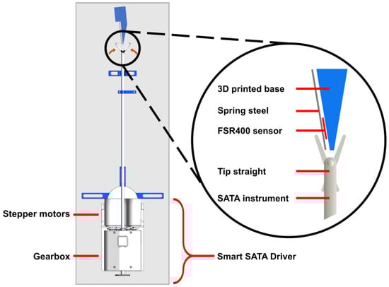 Illustration of the end-effector closing force test setup. The Smart SATA Driver was mounted on a Thorlabs breadboard and the SATA instrument was inserted and coupled in the Smart SATA Driver. A FSR400 force sensing resistor was positioned in the opened end-effector.