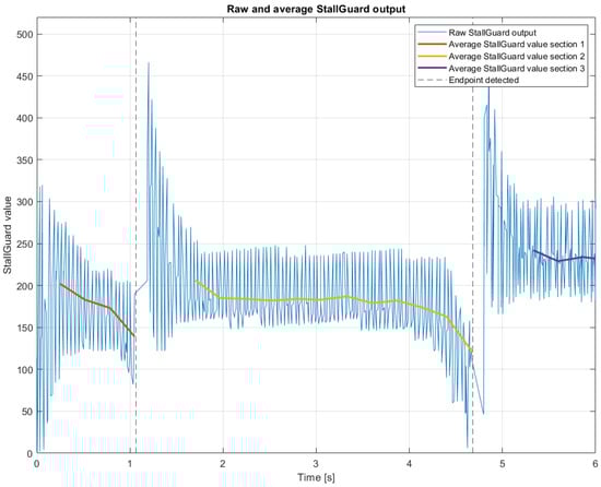 According to Equation (5), back EMF measurements are proportional to motor speed. Consequently, StallGuard values are reliable only when the motors operate at a certain speed. Initially, the motors must reach this speed, making the first values not useful, as illustrated in the first 0.10 s in Figure 8. To address this issue, the initial StallGuard recordings are excluded from processing to prevent incorrect triggering of the StallGuard threshold.