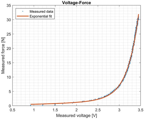 The voltage data of the tip sensor and the force readings from the load cell on the linear stage resulted in the voltage–force relationship shown in Figure 9. The second exponential fit analysis resulted in Table 1. This exponential curve was used to translate the voltage readings obtained by the tip sensor into force measurements. As can be derived from Figure 9 and Figure 10, the sensor has a baseline offset. This offset does not affect the non-zero force measurements when force is applied to the sensor. Using this setup, the sensor can accurately measure up to 10 N. Accuracy diminishes for higher forces up to 35 N.