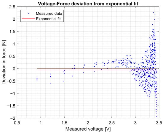 For each data point, the deviation between the fitted curve and the corresponding force is illustrated. The model’s accuracy for the tip sensor is approximately 0.5 N within the voltage range of 1 to 3 V. Beyond this threshold, the accuracy of the measurements diminishes.
