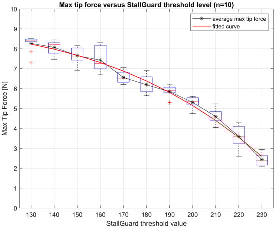 Boxplots of maximum tip force measured at different StallGuard threshold levels between 130 and 230. A regression analysis was performed using the second-order power series and is plotted as the fitted curve.