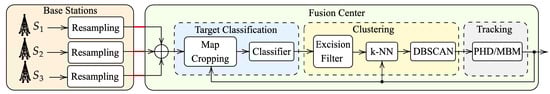 Block diagram of the sensing processing chain exploiting BS cooperation, target classification, and target-specific tracking. The BSs scan the environment, generating range–angle maps, and resample them according to a predefined grid. Resampled range–angle maps are then shared with the FC and fused in a single map. Target classification is performed at the FC through map cropping and classification (blue block). Then, clustering is performed to merge detections generated by the same target (yellow block). Finally, tracking algorithms perform target state estimation (gray block).