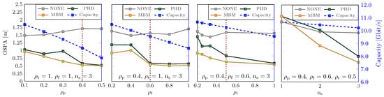 Sensing and communication capabilities versus the fraction of power , the fraction of subcarriers , the fraction of time slots , and the number of sensors . The PHD and MBM tracking algorithms (continuous lines) are compared to the case without tracking using OSPA (see the numerical scale on the left in meters). The average downlink aggregate capacity of the BSs is represented in blue (see the numerical scale on the right in bit/s).