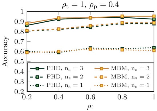 Moreover, in Figure 6, the system’s target recognition capability was evaluated by varying the fraction of subcarriers and the number of monostatic BSs cooperating to classify the target. Classification performance is measured through accuracy, which is defined as the ratio of correctly classified targets by the CNN to the total number of objects detected by the tracking algorithms. The CNN was trained to recognize two types of targets: car or pedestrian. It can be observed that for both PHD and MBM, the CNN successfully identified the target category when the number of BSs was , with its accuracy exceeding . For example, with and , the accuracy rose above .