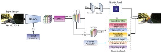 Subsequently, a multi-scale feature hierarchy is constructed by hierarchically upsampling the features processed by the AMPA. We obtain feature maps with resolutions of 1/16, 1/8, and 1/4 of the input image size, respectively. We employ feature alignment operations to achieve a unified representation of multi-scale features, and feature concatenation is used to establish a joint semantic expression across multiple scales. During the feature fusion stage, we improve detection capability for multi-scale vehicles and address issues such as blurred object boundaries. For the heatmaps output by the keypoint branch, a set of response values is generated by applying a two-dimensional Gaussian kernel centered at the actual target point locations. The ground truth value of the vehicle center point on the heatmap corresponds to the pixel-level maximum response generated at the Gaussian kernel location. For depth prediction in the regression branch, an uncertainty-guided depth ensemble is designed, which adaptively fuses multiple depth estimation methods through weighted aggregation, thereby improving the model’s depth estimation precision and robustness. The regression vector of this network primarily includes center point offsets , 3D box vertex offsets , vehicle residual scales , orientation angles , direct depth , uncertainty estimates , and geometric depth , among others.