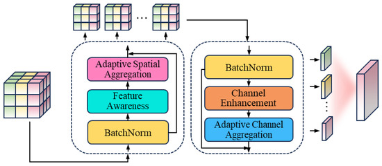 The proposed AMPA is an architecture designed for aggregating multi-order contextual and channel information. The structure is shown in Figure 3. It aims to capture semantic correlations in contextual information and channel dependencies between features. The AMPA consists of four core sub-modules: feature perception module, adaptive spatial aggregation module, channel enhancement module, and adaptive channel aggregation module. The subsequent sections will delve into the specifics of each component’s construction and capabilities.