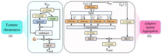 The adaptive channel aggregation (ACA) module addresses the key issues of insufficient channel dependency modeling and information redundancy in traditional methods. As shown in Figure 5b, it is designed with a channel compression and difference enhancement mechanism. First, a dimensionality reduction mapping is performed on the features along the channel dimension, capturing global dependencies between channels. Specifically, depth-wise convolutions are introduced to refine the feature representation of channels. The weighted difference information is fused with the original input features to generate richer output features: