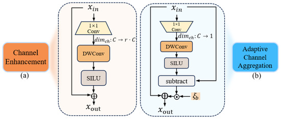 The channel enhancement (CE) module enhances the representational capability of input features and generates high-dimensional channel features. The CE module is shown in Figure 5a. First, it expands the number of feature map channels from the original dimension C to a higher dimension . The SILU [45] activation function enhances discriminative feature representation through non-linear mapping. Specifically, the residual connection design enables the learning of residual mappings based on original features. The output is obtained through residual connection, which combines the input and transformed feature representations:
