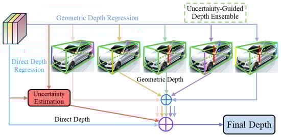 Illustration of the UGDE. In the geometric depth regression branch, we design five sets of geometric depths, including the vertical height of the vehicle center point and the heights of various diagonal combinations, and input them into the depth ensemble module.