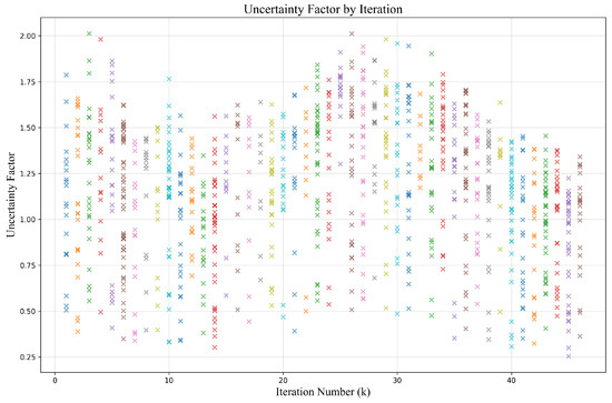 The uncertainty factor visualization. We present the values of the uncertainty factor at different iterations during the training process. We use different colors to more intuitively distinguish the uncertainty factor at different iterations.