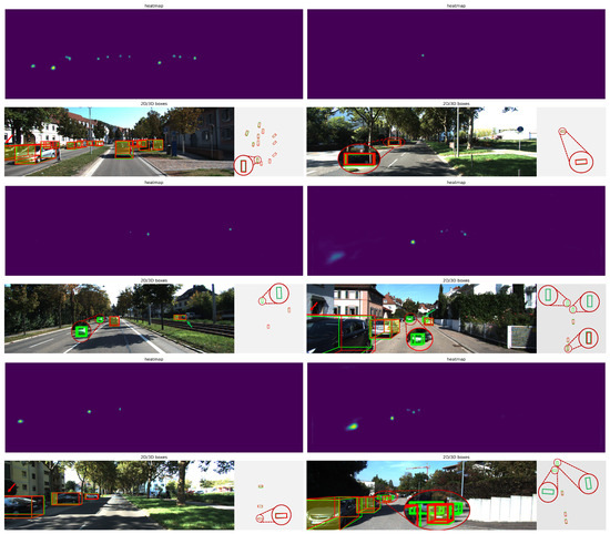 In this section, we visualize the detection results in various scenarios to comprehensively assess the performance of the proposed approach, including heatmaps, 3D bounding boxes, and bird’s-eye views. As shown in Figure 8, we compare the predicted results of the proposed approach with actual scenes, demonstrating its performance in complex scenarios such as dense vehicle crowds, varying object sizes, occlusions, and truncated targets. The red denotes the ground truth, while the green indicates the predicted bounding boxes.