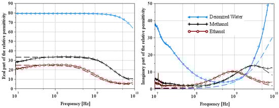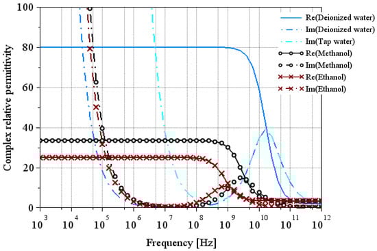 Different liquids with precisely known permittivity can be used as reference and to calibrate the experimental procedures. For our study, we chose deionized water, methanol, and ethanol as references. Their complex relative permittivity can be defined by Equation (1) from the Cole–Cole model [], extended with the ionic conductivity term, using the different parameters given in Table 1 (from the work of Wagner et al. []) and the measured conductivities (using the Consort K912 conductivity meter) given in Table 2: