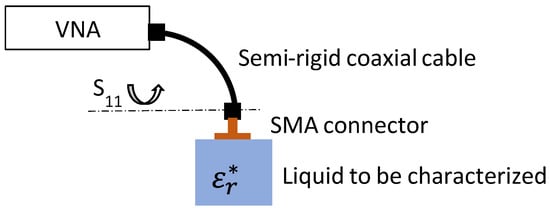 To characterize the different liquids in the microwave domain, we used a coaxial probe in an open circuit immersed in the liquid under test. Microwave measurements of the reflection coefficient (S11) were performed using a Keysight P9372A 300 kHz–9 GHz vector network analyzer (VNA). Calibration of the measurement system (VNA + semi-rigid coaxial cable) was carried out automatically using an electronic kit (Keysight ecal N7552A commercial device) at the input probe plane. As shown in Figure 3, this reference plane of the measurement (identified by S11) is located at the output of the male connector of the semi-rigid coaxial cable of 50 Ω characteristic impedance, i.e., at the coaxial probe input.