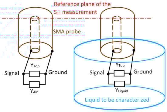 The second permittivity extraction method we set up is the one developed by Lacrevaz et al. [] using two reference media (air and deionized water). This method was developed for a coplanar Ground Signal Ground radiofrequency microprobe on a 1–67 GHz range. In our configuration, the setup of the measurement is described in Figure 4. The SMA probe is charged by two parallel admittances: YTop is the admittance including systematic residual errors of calibration and YAir and YLiquid represent the admittances due, respectively, to the air and the liquid to be characterized.